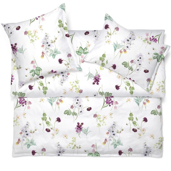 Das Bettwäsche-Design FREYA -blanc- präsentiert ein zartes Potpourri aus schillernden Grüntönen zusammen mit fliederfarbenen und beige-roséfarbenen Blüten. Bunt gemischt aus Frauenmantel, Rittersporn, Christrosen, Glocken- und Schachbrettblumen und gekonnt ergänzt mit Salbei-, Buchen- und Birkenblättern inspiriert FREYA für einen ausladenden Blumenstrauss.