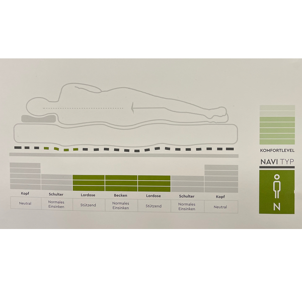 Der Nautiflex-Schaum vermittelt eine sehr gute Körperunterstützung und Druckentlastung und passt sich jeder Bewegung gut an. Durch die aufwendige Oberflächenschnitttechnik durch Würfelschnitte wird eine hervorragende 7 Zonen Einteilung erreicht. Die Matratze verfügt über eine optimal abgestimmte Körperzonierung, die durch verschiedene Formschaumteile mit unterschiedlichem Härte- und Raumgewichten erreicht wird. Die Werkmeister M S55 KOMFORT Pro ist für Menschen breiteren Schultern (im Verhältnis zum Becken) konzipiert worden, d.h. das die Schulterpartie stärker ausgeprägt ist. Die Matratze hat daher ein schulterbetonte Wirkweise mit ausgeprägter Schulterzone. Die Beckenzone gibt weniger nach (nur leichtes Einsinken) und ist stark stützend.