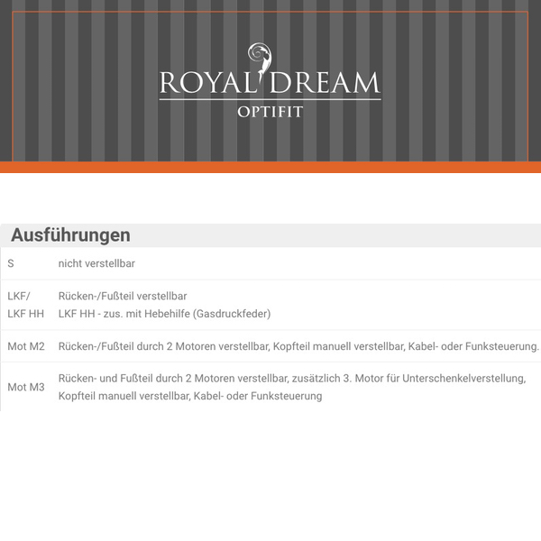 - Mot M2 :(langes) Rücken- und Fußteil durch 2 Motoren verstellbar, Kopfteil manuell verstellbar, Kabel- oder Funksteuerung