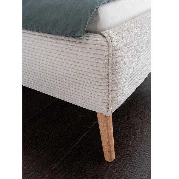 Die runden Füße aus massiver Wildeiche setzen natürliche Akzente und sorgen für Stabilität und Langlebigkeit. Die Einlegetiefe von 16 cm sowie die massiven Auflagen für Lattenroste, die im Lieferumfang enthalten sind, garantieren eine optimale Matratzenauflage und höchsten Schlafkomfort.