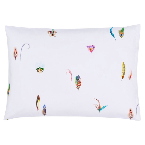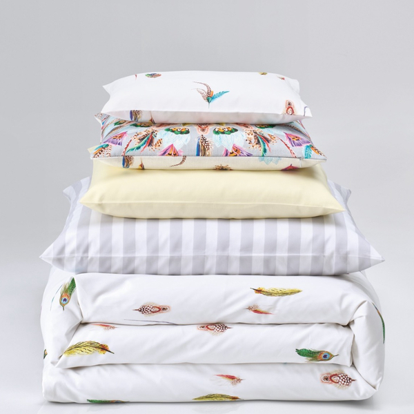 FEATHERS ist die charmante Weiterentwicklung des ikonischen Designs LE PIUME von Christian Fischbacher. Die von Hand gezeichneten Federbouquets greifen das klassische Thema mit einem Augenzwinkern auf. Die Motive erinnern an die goldenen 20er Jahre, als Federn von Paradiesvögeln und Papageien den modischen Auftritt europäischer Frauen prägten. Als Ornamente locker über die Bettwäsche verteilt, kommen diese auf dem weissen Fond besonders schön zur Geltung und verleihen der Bettwäsche eine frische Ausstrahlung.