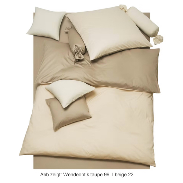 Hinweis: Die Abbildung zeigt die Bettwäsche in Wendeoptik (Doubleface Optik) taupe 96 I beige 23. Zum Lieferumfang gehört nur ein Deckenbezug + ein Kissenbezug in der gewählten Größe. Zusatzkissenbezüge sind optional gegen Aufpreis erhältlich.