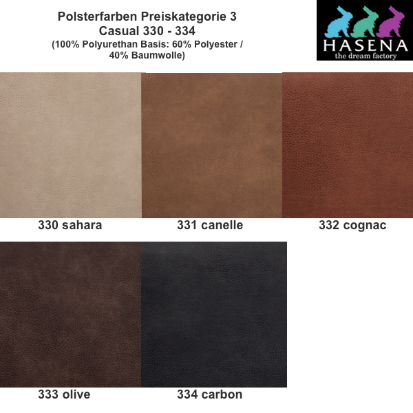 - Casual (Kunstleder) : sahara 330, canelle 331, cognac 332, olive 333, carbon 334